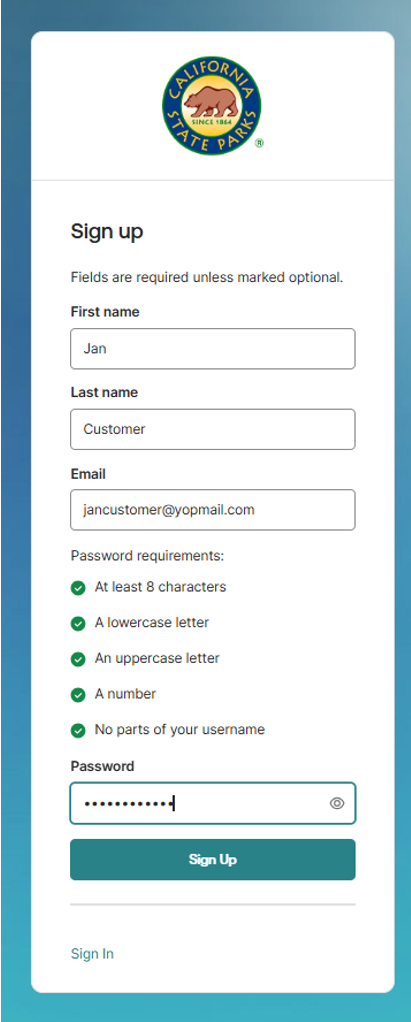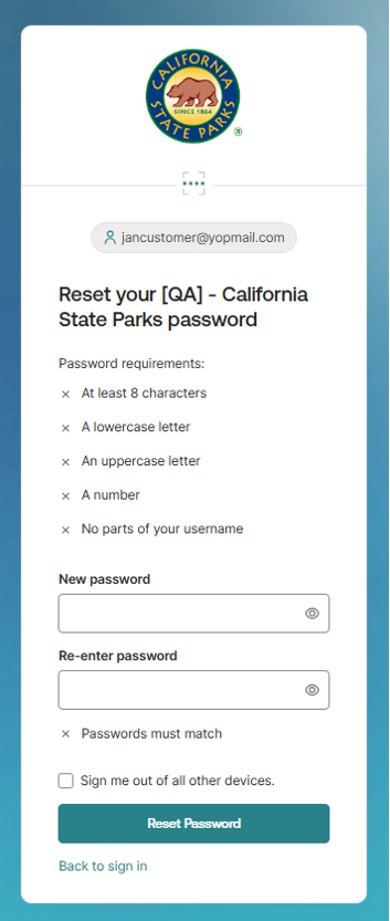 After selecting the 'Reset Password' link from the email, you will be prompted to 'Reset your California State Parks password'. Enter a new password that meets the requirements listed on the screen: