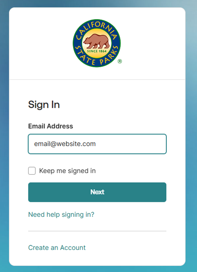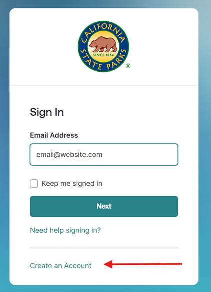 Select 'Login/Create Account' on the upper right corner of the reservecalifornia.com homepage. Shown here: