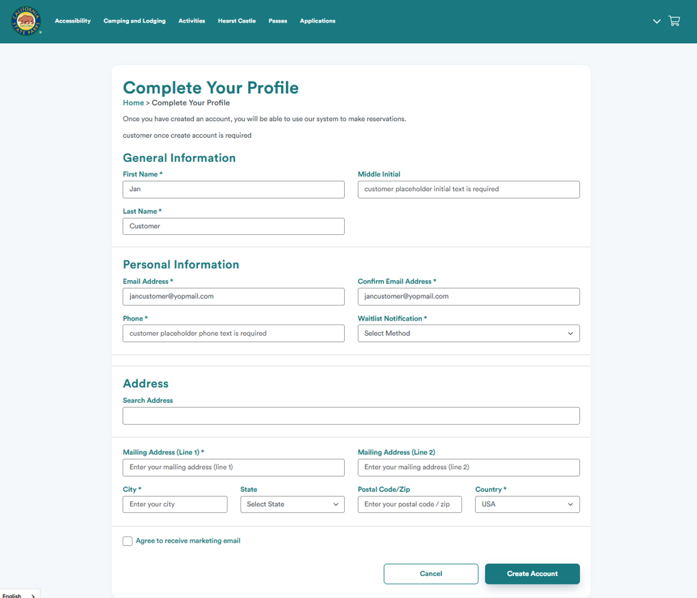 You will be prompted to 'Complete your Profile'. Update all required fields and select 'Create Account':